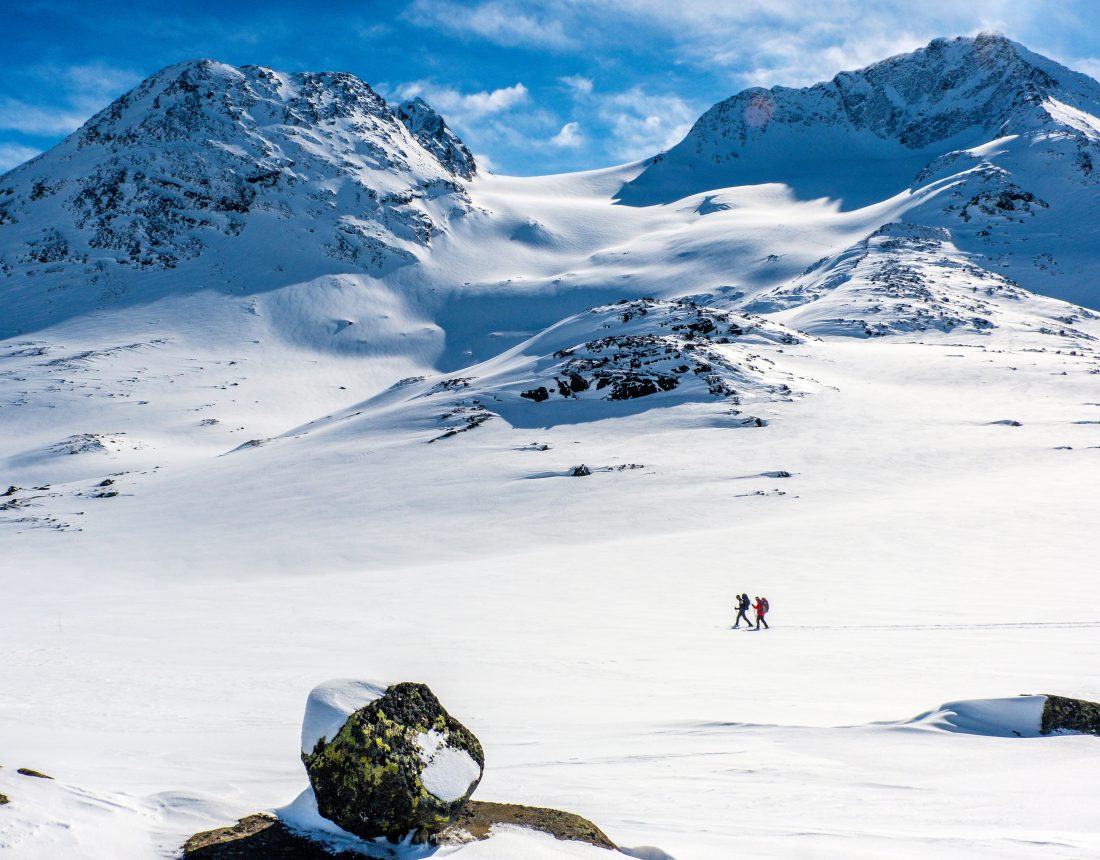 We left the ski village and headed north into the Jotunheimen – the ‘land of the giants’ in Norse mythology and the land of the giants in Scandinavian mountain geography as it contains northern Europe’s two highest peaks, Galdhopiggen and Glitertinden. It is an area of sharp alpine peaks, black cliffs, sweeping glaciers and frozen lakes. The weather for this section alternated between dazzling blue sky days and bleak, snowy days with flat light and poor visibility.