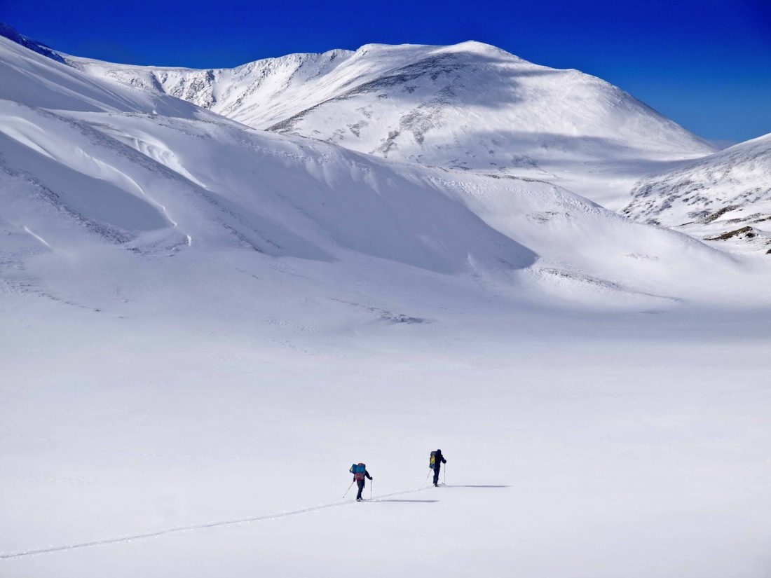 The first 9 days of our trip took us across the Hardangervidda, Europe’s largest plateau at 2,500 square miles of treeless, barren, tundra. There are few signs of life in between the DNT cabins and its enormous herds of wild reindeer manage to keep themselves hidden. The landscape is big, with wide valleys and modest mountains and the routes between huts meander through the hills, crossing frozen lakes, following river valleys and crossing low cols.